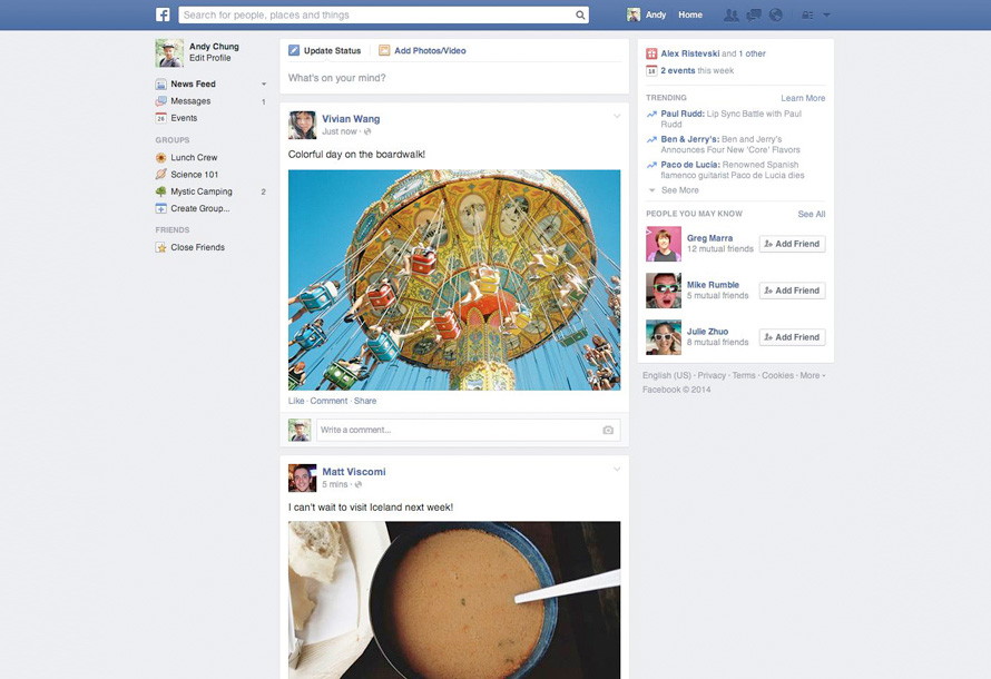 Si véis la imagen que acompaña al post os daréis cuenta de que se asemeja mucho al anuncio que hicieron hace un año. Podríamos decir que es una evolución de aquella gran actualización que, por lo menos a nosotros, nunca nos llegó. Según Greg Marra, uno de los gerentes de Facebook, el rediseño esta vez se lo han pensado bastante: «Durante el último año hemos estado tomandonos un tiempo y escuchando lo que la gente piensa sobre el rediseño, con un montón de entrevistas con los usuarios para comprender qué partes estaban trabajando y qué partes no.»