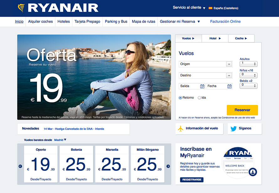 ¿La noticia os pilla de sorpresa? ¿Estabais ya resignados a asociar para siempre el sitio web de Ryanair con las palabras “confusión” y “frustración” al finalizar la reserva de un vuelo? Pues nos alegramos de difundir la buena noticia, y aquí podéis ver el resultado de la campaña de optimización de la imagen de la compañía.